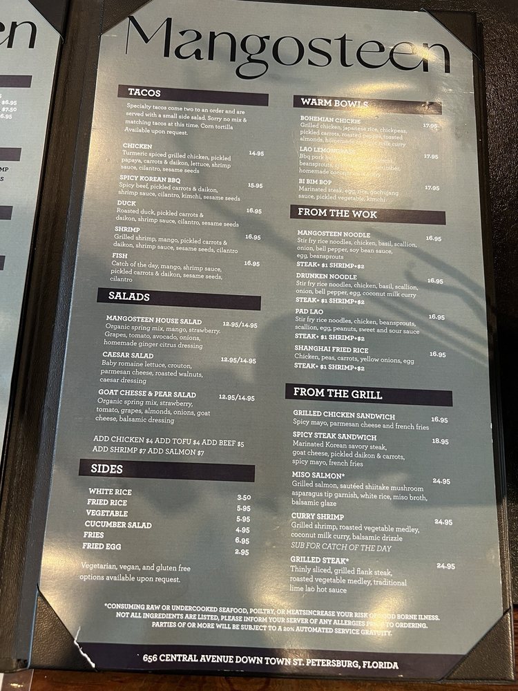 Welcome to Mangosteen II, an exciting culinary venture located at 3825 Northdale Blvd, Tampa, FL. This vibrant eatery seamlessly blends Thai flavors with taco traditions, offering a unique selection that caters to diverse palates. The menu features tantalizing options like the Chicken Taco with turmeric-spiced grilled chicken and a medley of fresh toppings, as well as the succulent Duck Taco. Seafood lovers can indulge in a fresh Fish Taco or Shrimp Taco, showcasing the catch of the day.